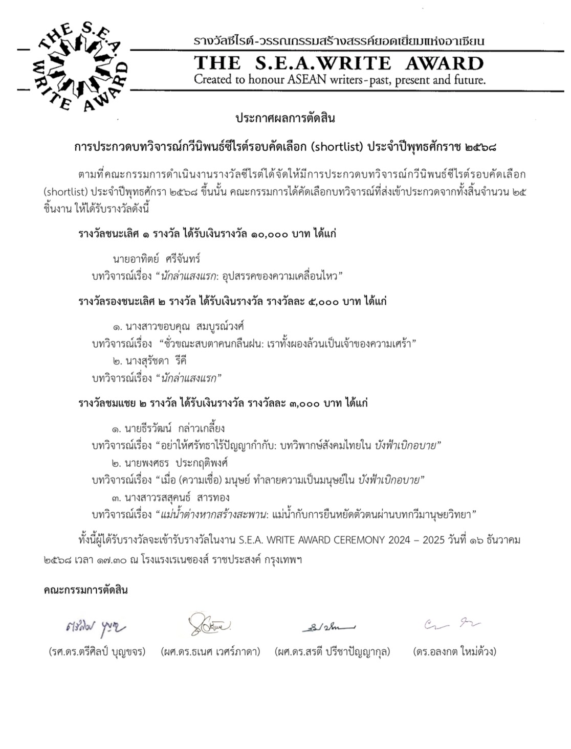ประกาศผลการตัดสินการประกวดบทวิจารณ์ กวีนิพนธ์ซีไรต์ รอบคัดเลือก (Shortlist) ประจำปีพุทธศักราช 2568