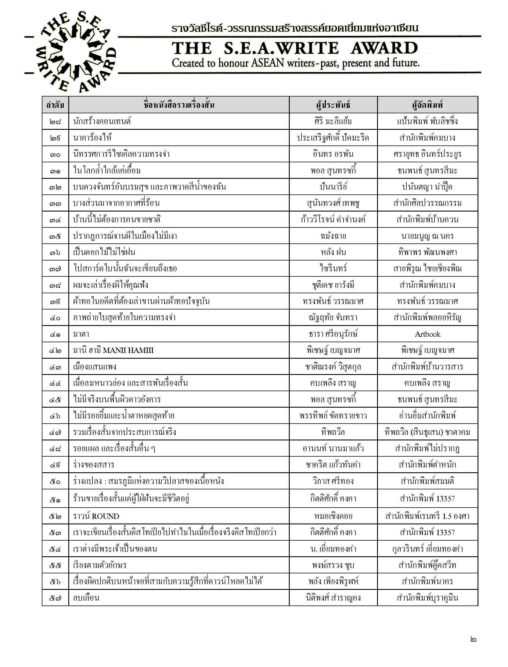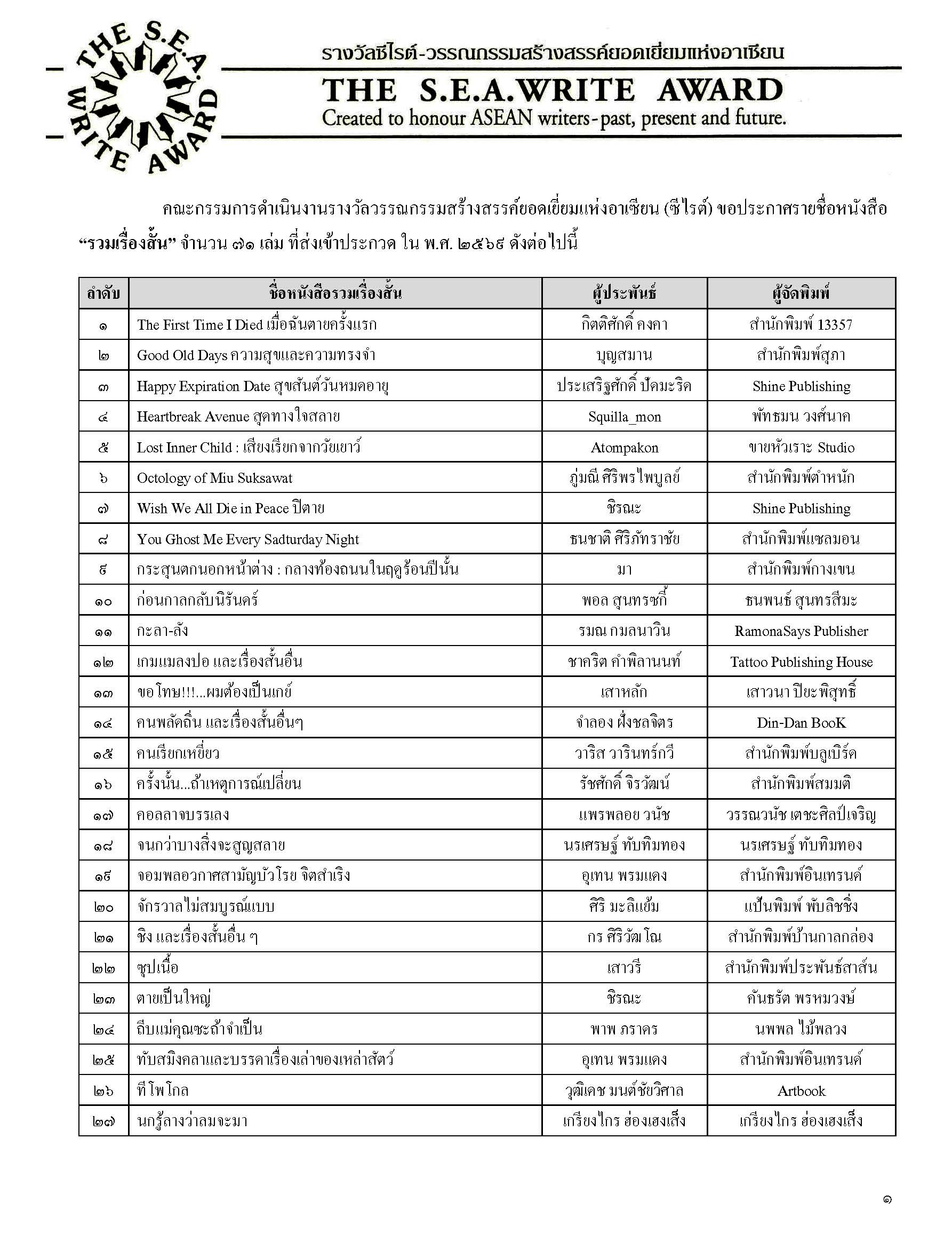 ประกาศรายชื่อหนังสือ “รวมเรื่องสั้น” จำนวน ๗๑ เล่ม ที่ส่งเข้าประกวดรางวัลซีไรต์ ใน พ.ศ. ๒๕๖๙