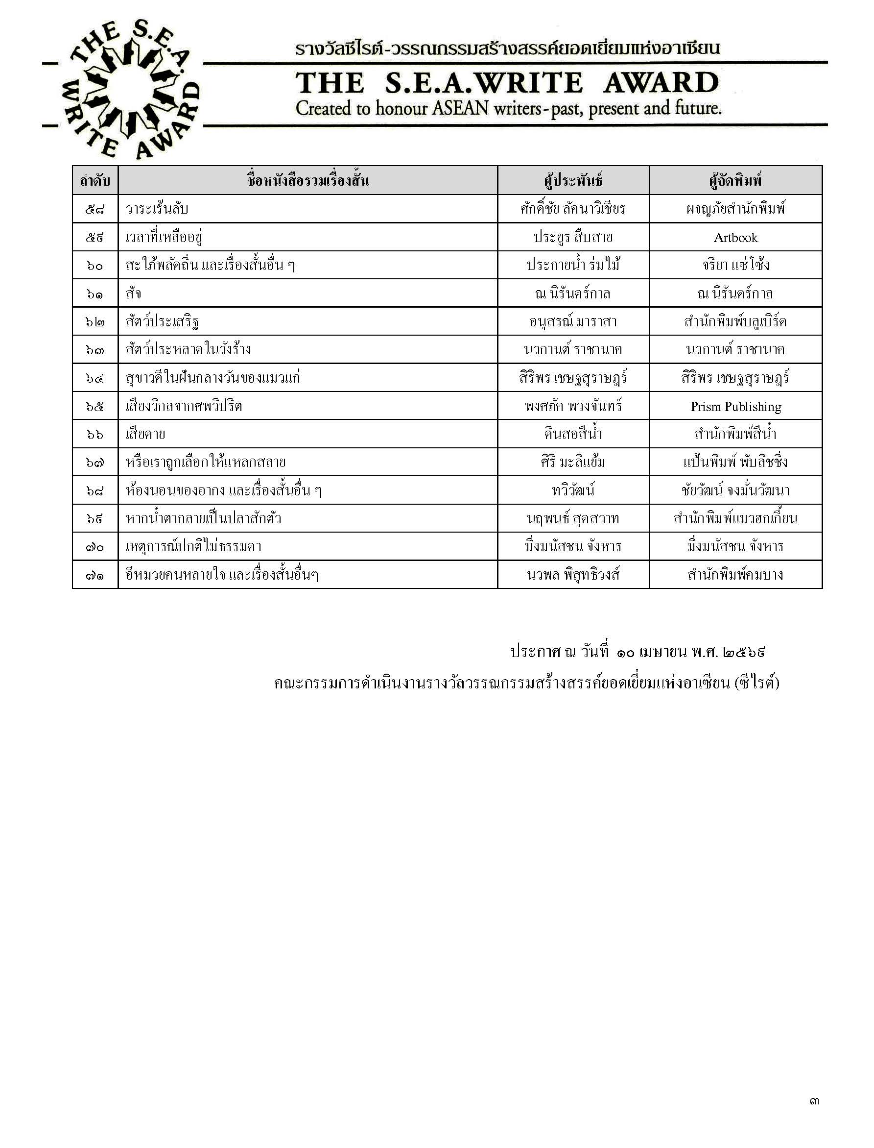 ประกาศรายชื่อหนังสือ “รวมเรื่องสั้น” จำนวน ๗๑ เล่ม ที่ส่งเข้าประกวดรางวัลซีไรต์ ใน พ.ศ. ๒๕๖๙